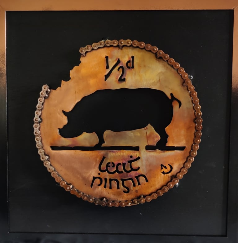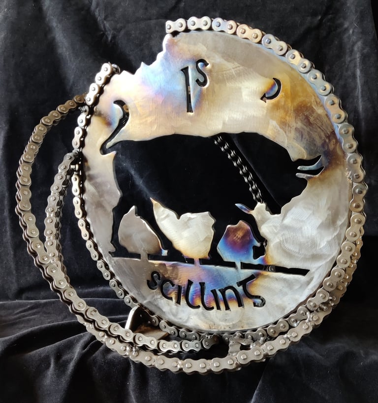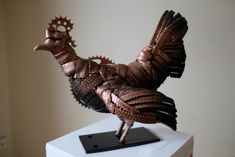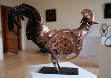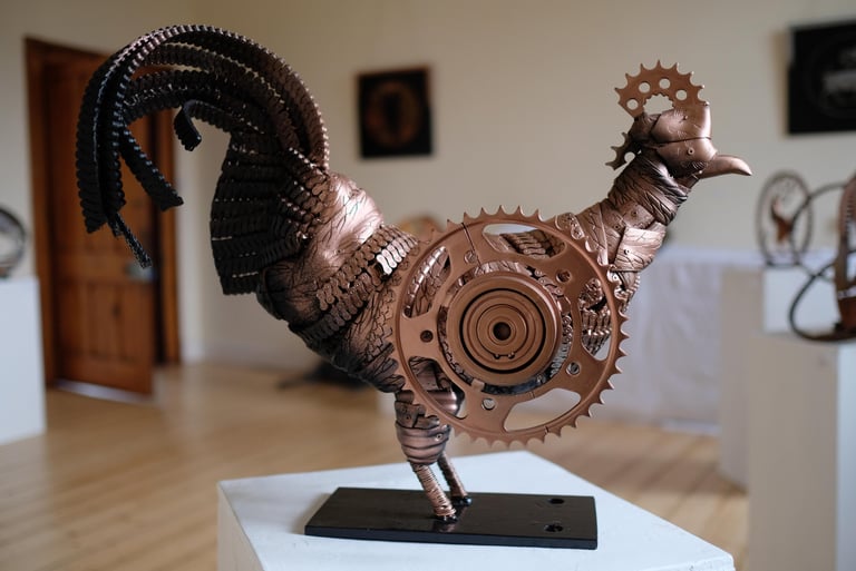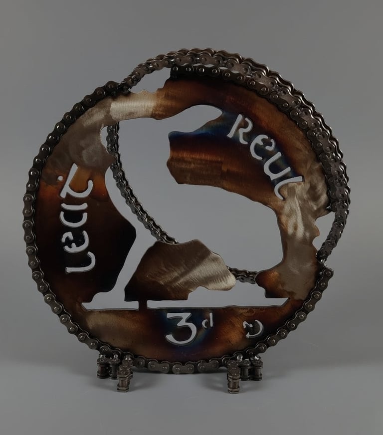 The 'Pingini' exhibition is an evocative exhibition that explores the intersection of Irish numismatic history, wildlife conservation, and sustainable artistry. Featuring a collection of sculptures, the artist breathes new life into the iconic "Pingini" coin series originally designed by Percy Metcalfe in 1928. These artworks were made from old bike cogs, chains & steel.